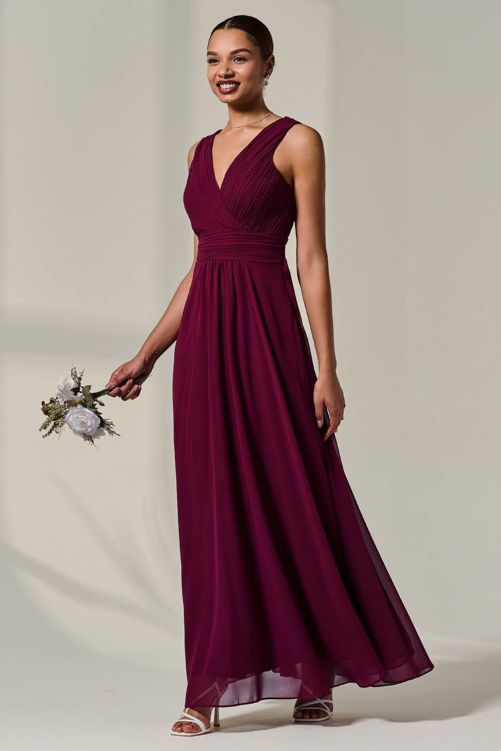 Elegant maxi dress in burgundy chiffon featuring a flattering V-neckline and concealed side zip fastening. The flowy hem adds a touch of grace, perfect for special occasions.