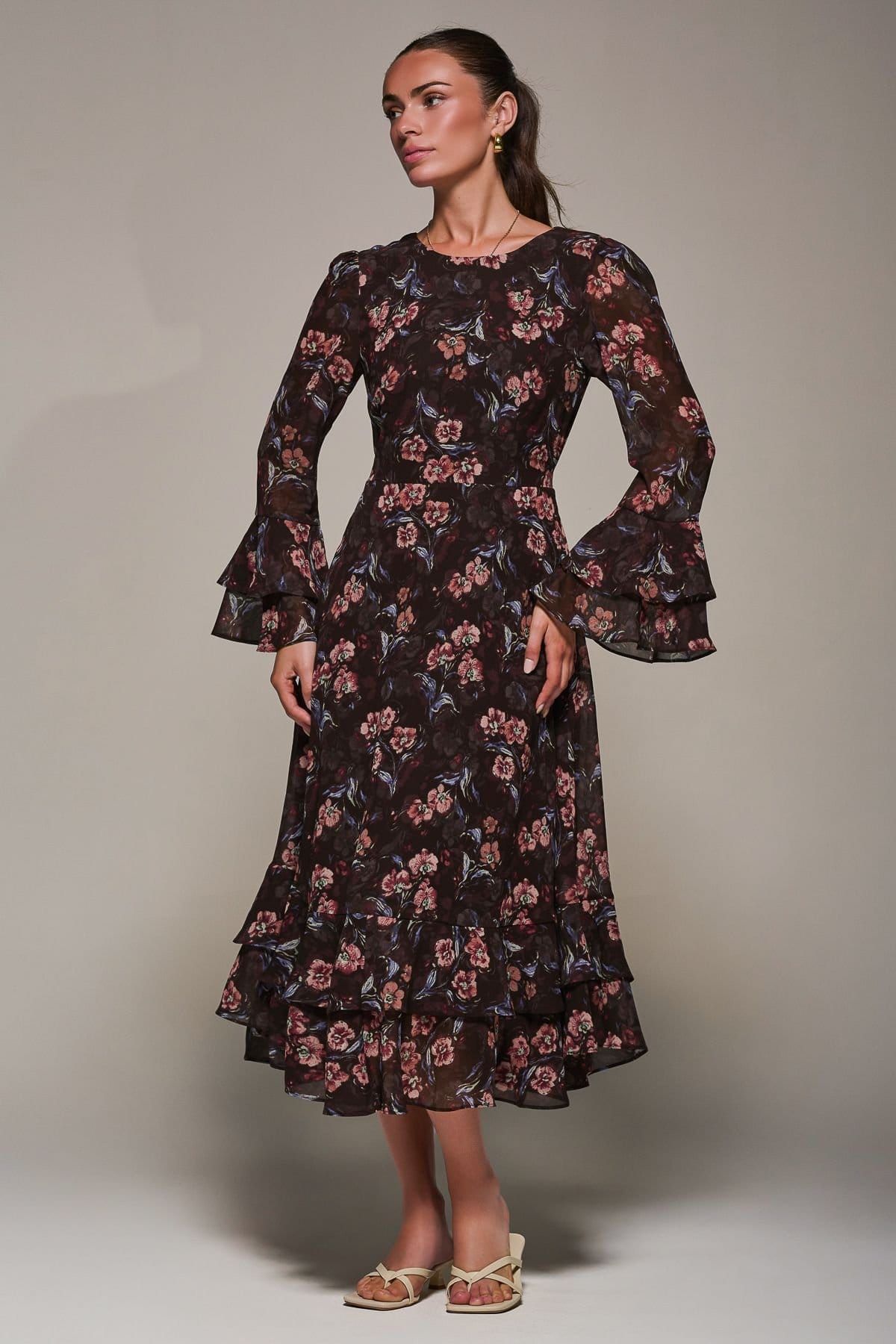 This Burgundy floral chiffon midi dress features tiered ruffle cuffs and a matching hem that sits at the perfect midi length. The round neckline and tie waistband create extra shape. With discreet front side pockets and a concealed centre back zip, this dress is easy to wear.