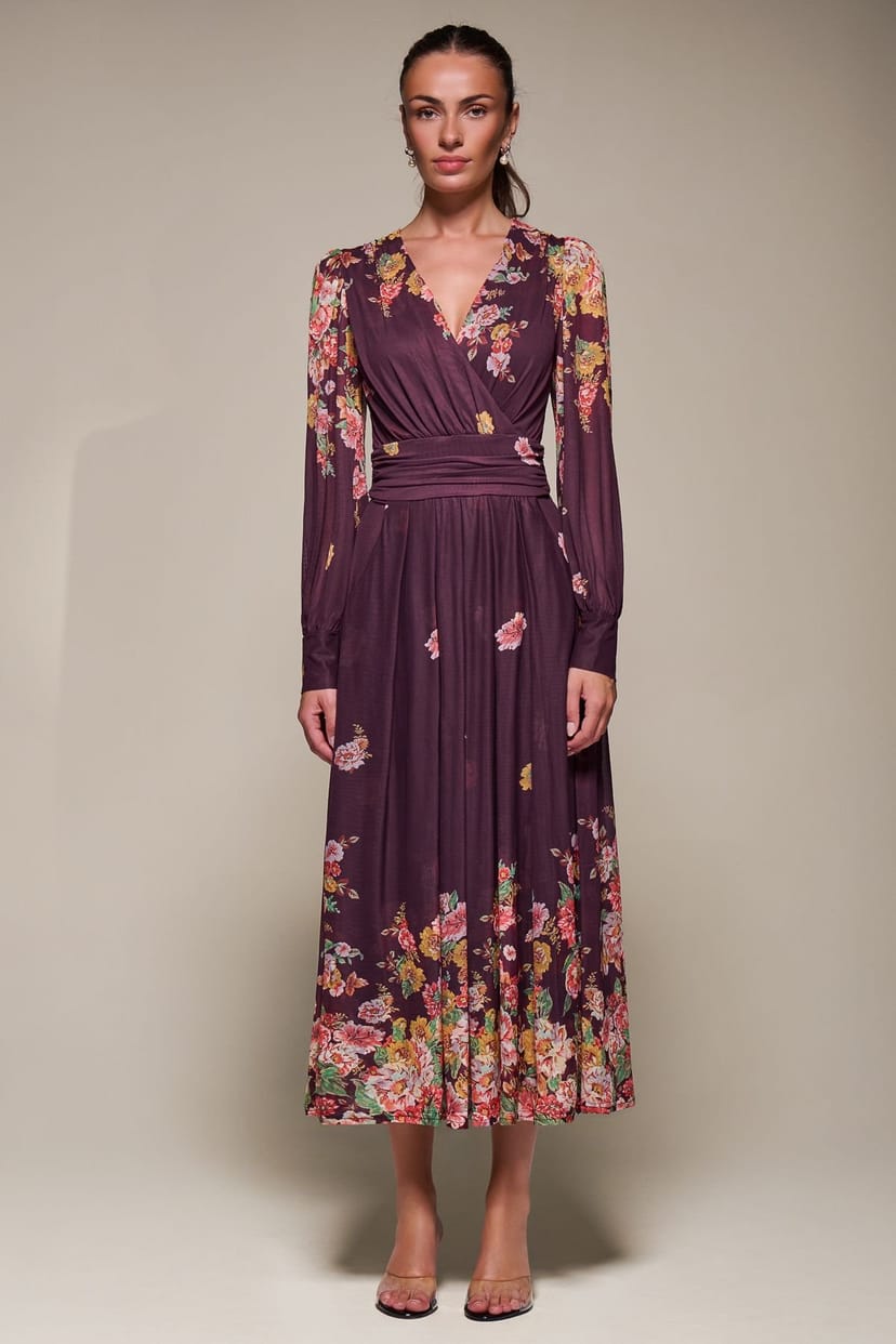 Elegant midi dress in burgundy with a floral print. Features a wrap-around neckline and long sleeves. Perfect for special occasions with its flattering fit.
