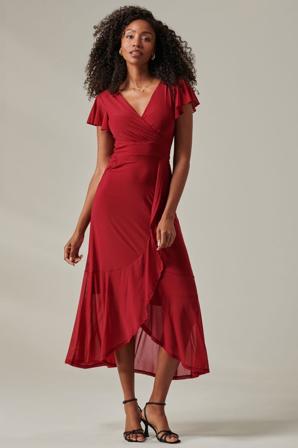 The Jolie Moi Burgundy Wrap Mesh Midi Dress is ideal for evening, date-night, party.