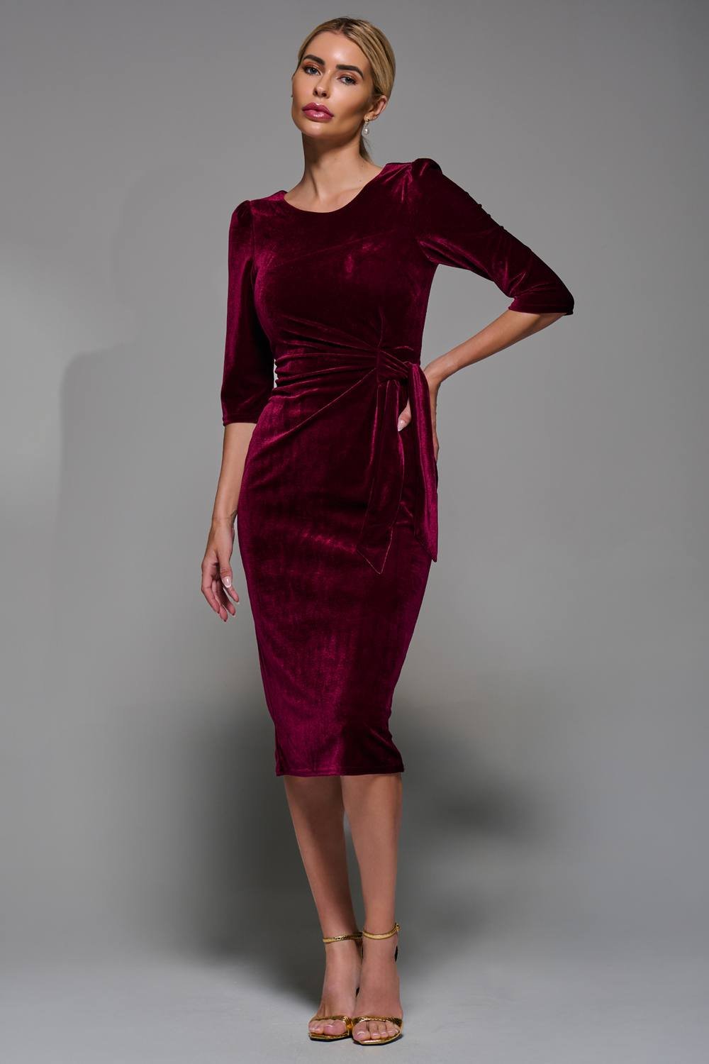 Luxurious burgundy velvet bodycon dress with a rounded neckline and half sleeves. The side tie detail cinches the waist, creating a flattering silhouette. Ideal for evening events or special occasions.
