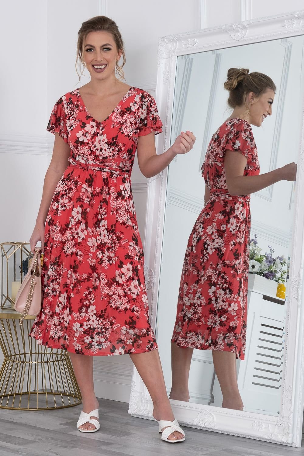 Charming midi dress in coral floral mesh with a flattering fit-and-flare silhouette. Features a V neckline and short angel sleeves, perfect for a laidback yet stylish look.