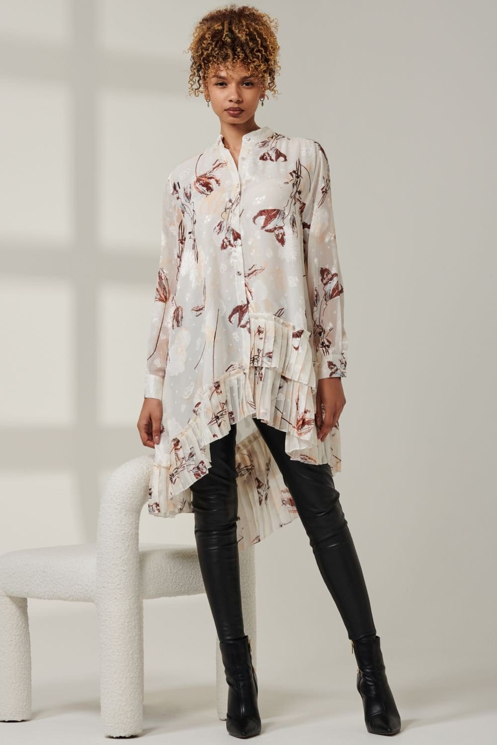 Modern sophistication with the asymmetric tiered hem cream chiffon shirt. Features long cuffed sleeves and an open button collar. Perfect for casual and semi-formal occasions.