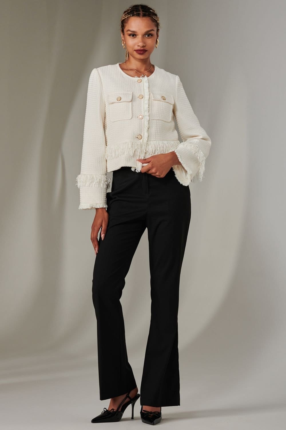 The Jolie Moi Cream Tweed Jacket with Fringe Hem is ideal for evening, party, date-night.