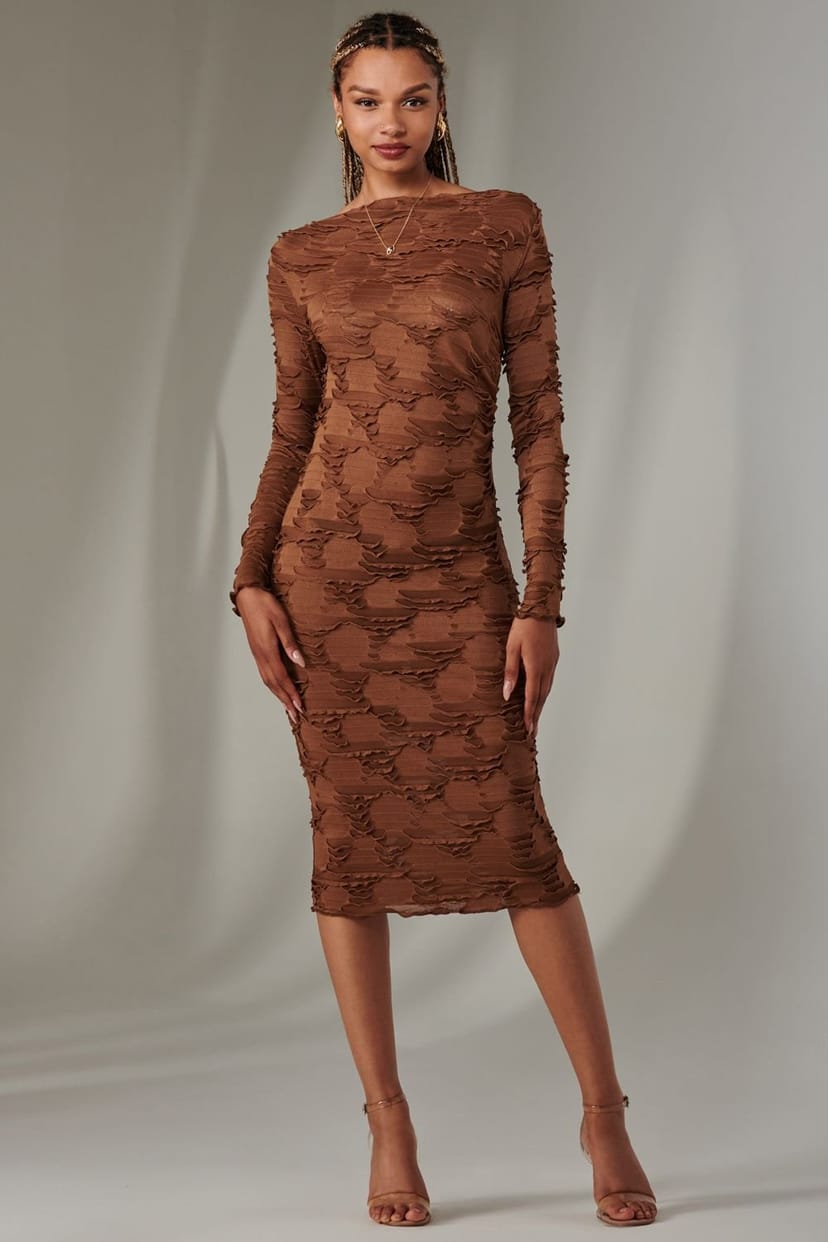 The Jolie Moi Dark Brown Textured Long Sleeve Midi Dress is ideal for evening, date-night, party.