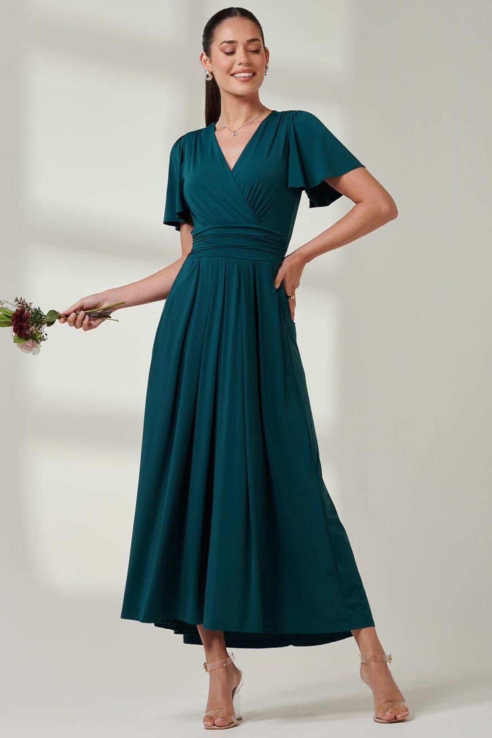 This dark green jersey maxi dress features a flattering wrap bodice and ethereal angel sleeves. The flowing maxi length and self-tie make it perfect for any special occasion.