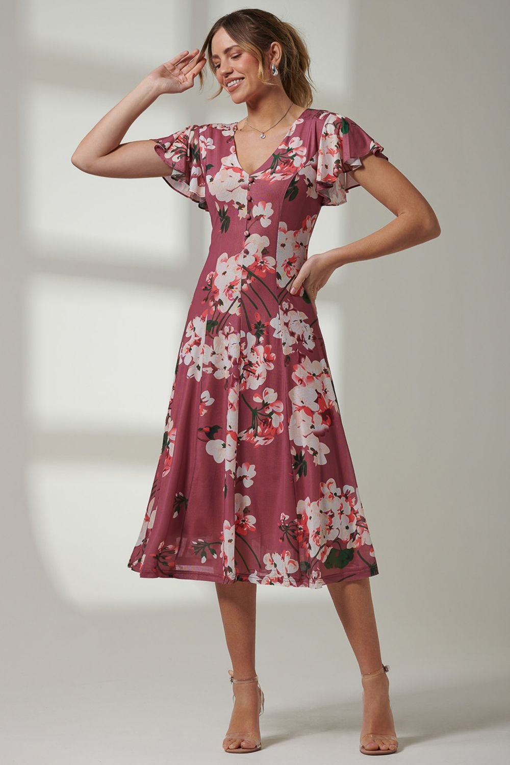 Charming Jolie Moi dress in dark mauve with a floral print. Features a wrap-over v-neckline, flare capped sleeves, and a flattering fit & flare silhouette. Ideal for evening events or date nights.