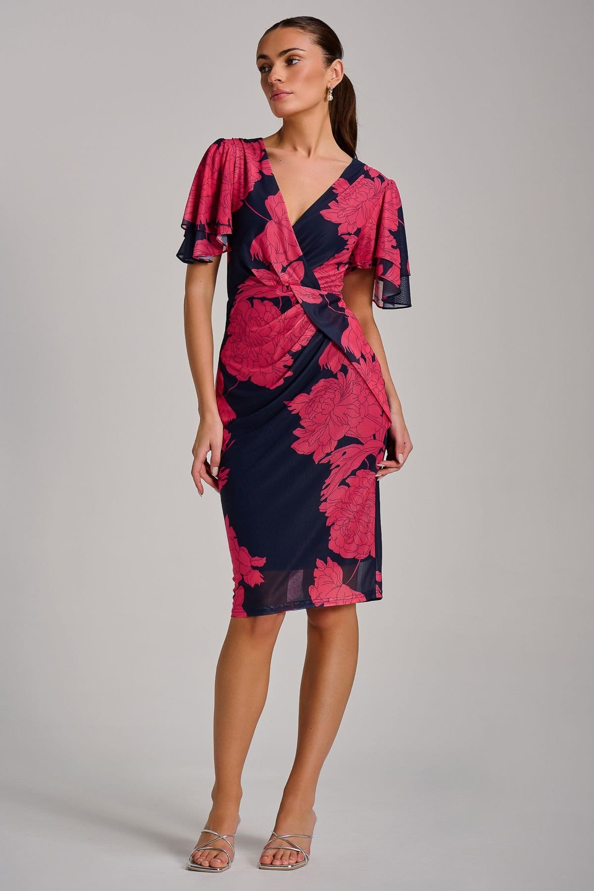 This dark navy floral mesh dress from Jolie Moi features short angel sleeves and a wrap V-neckline. Made from delicate mesh fabric, it has a ruched wrap skirt and a fully lined bodycon silhouette, perfect for special occasions.