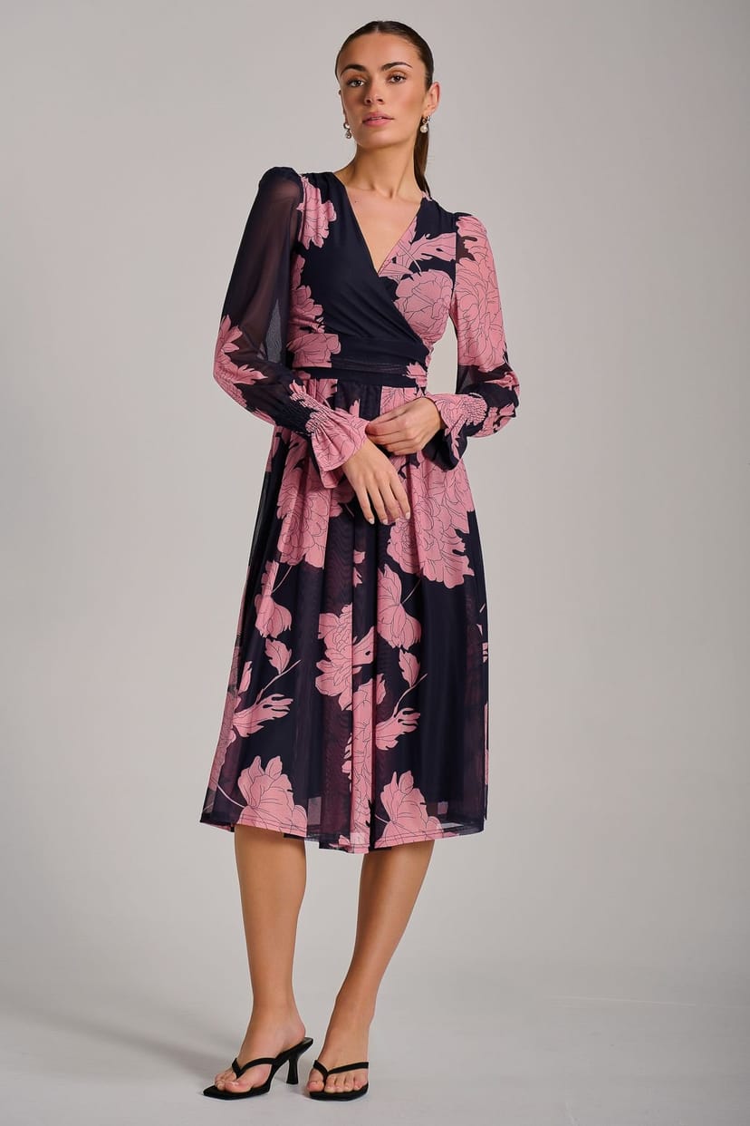 This Jolie Moi midi dress features a wrap V-neckline and long shirred flare sleeves. Made from printed mesh fabric, it offers a flattering silhouette with a thick waistband and tie-back detail. Perfect for casual outings or evening events.