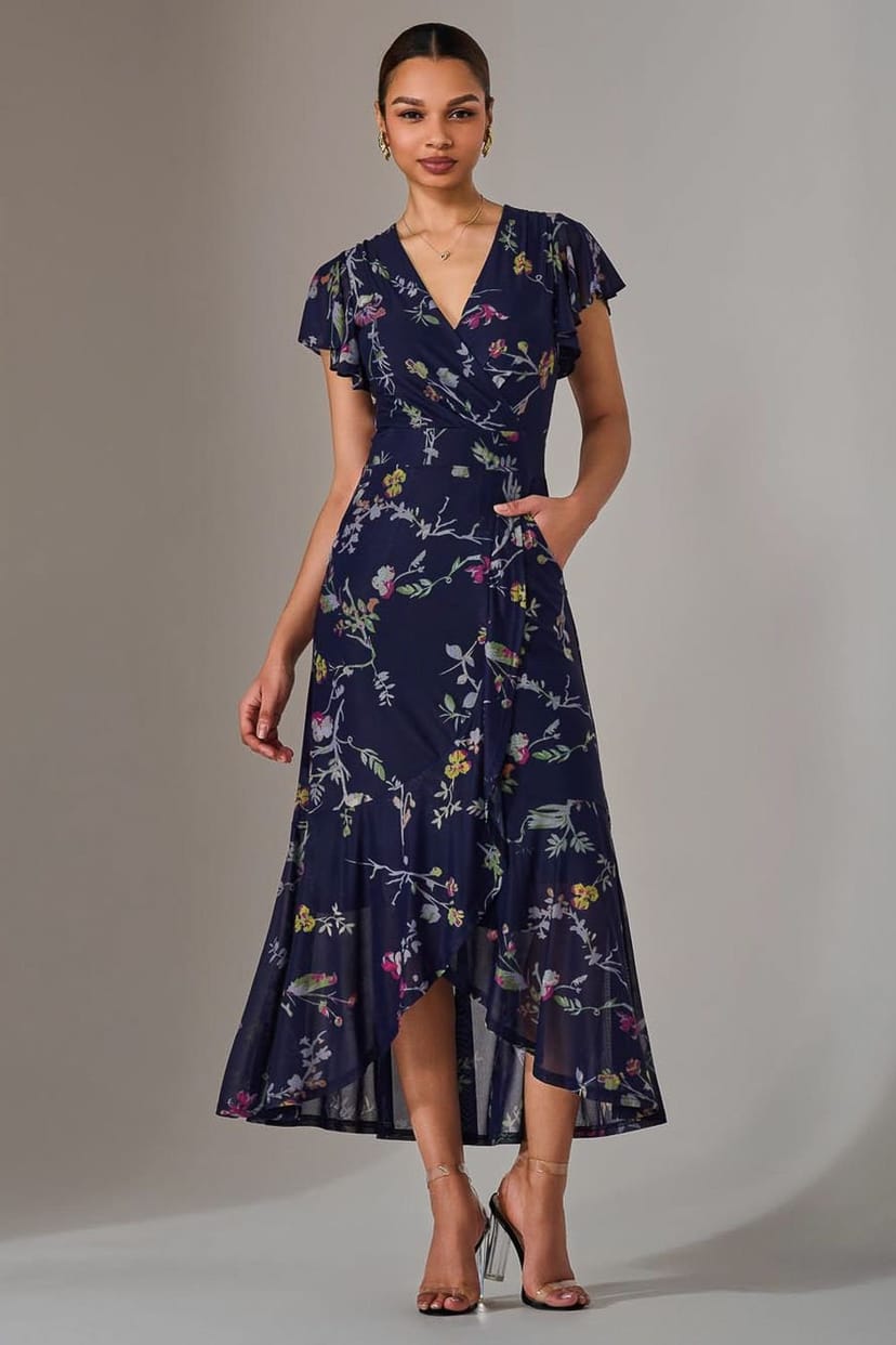 The Jolie Moi Dark Navy Floral Mesh Frill Hem Maxi Dress is ideal for evening, date-night, party.