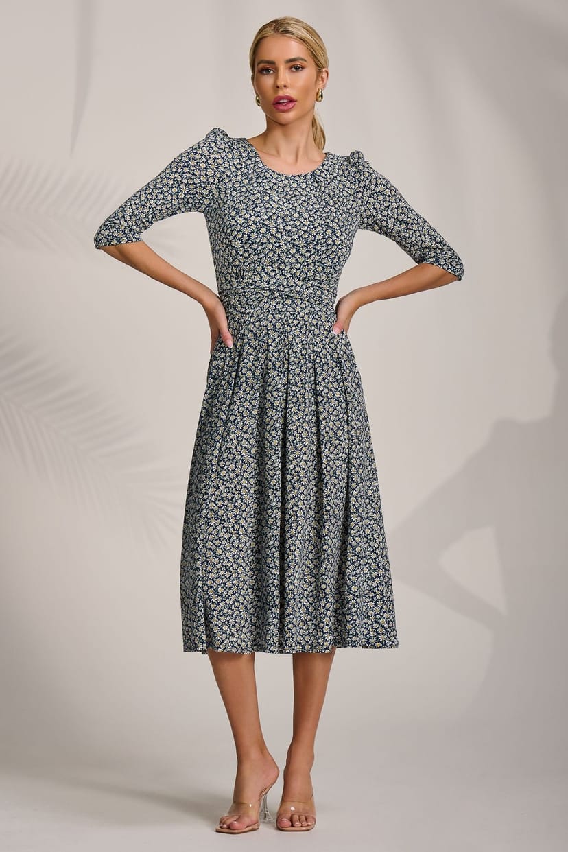Charming dark navy floral jersey midi dress by Jolie Moi. Features a round neckline with delicate pleats, a ruched waistband with two pockets, and a flowing pleated skirt. The 3/4 length sleeves are slightly gathered, and finished with a tie at the waist.