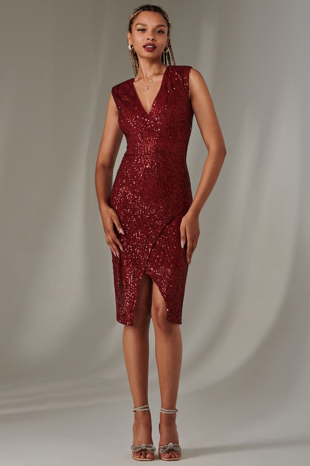 Glamorous dark red sequin bodycon dress by Jolie Moi. Featuring a wrap-over V-neckline and a front slit for a touch of allure. Perfect for evening events or special occasions.