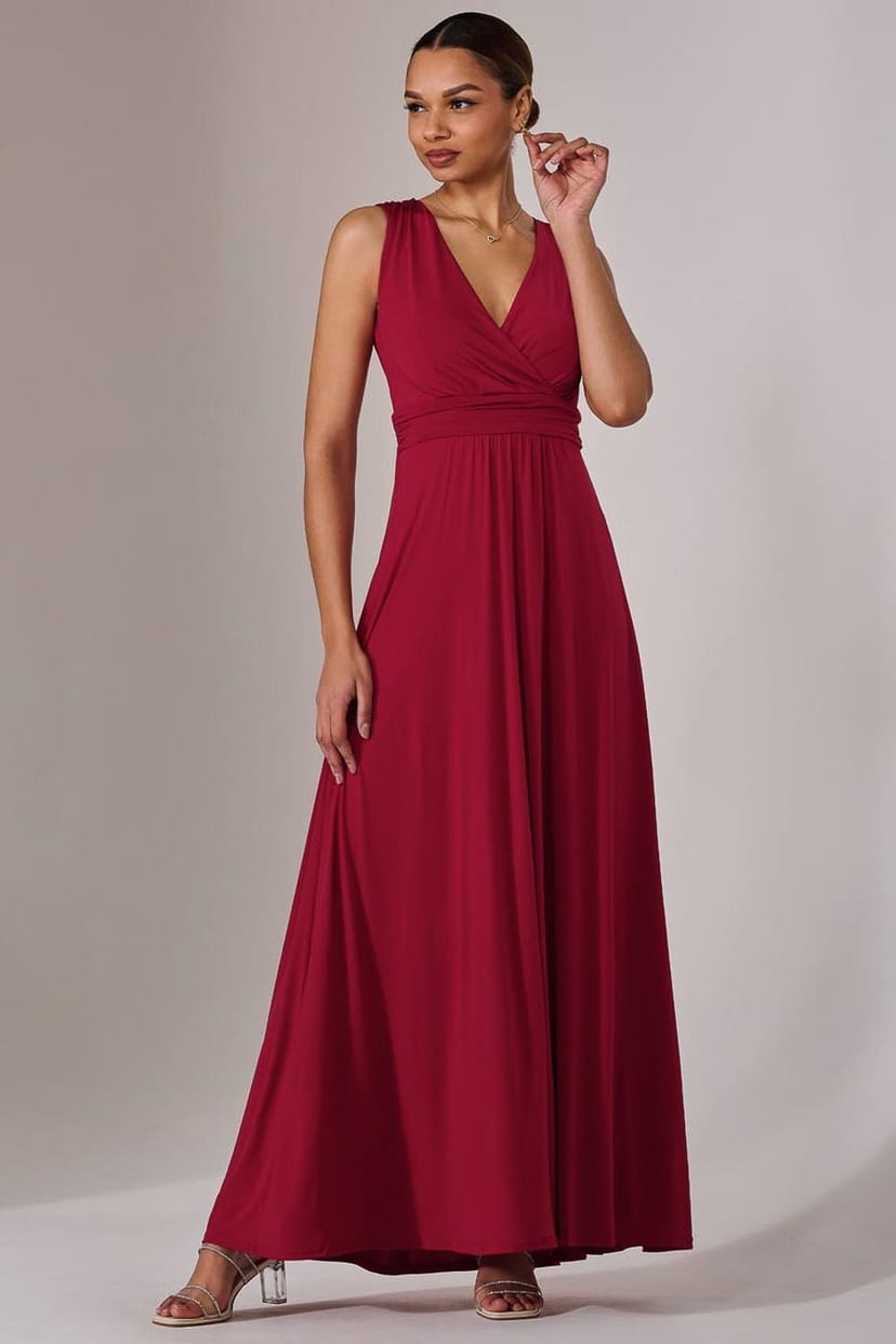 Elegant maxi dress in dark red jersey fabric. Features a V-neckline and wrap bodice for a flattering fit. Perfect for evening events or special occasions.