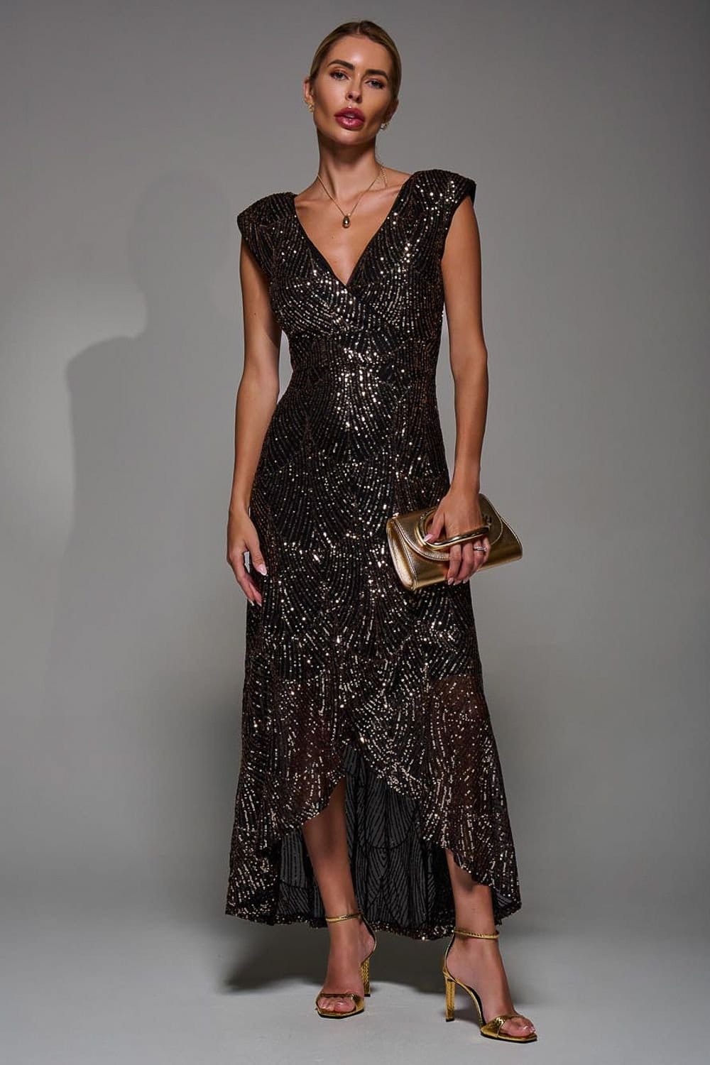 This gold sequin evening dress by Jolie Moi features a wrap front with a V-neckline and an asymmetric frill skirt. Perfect for making a statement at evening events.