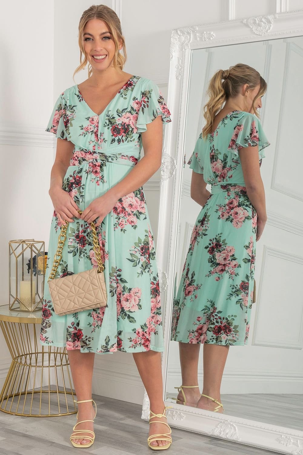 Charming midi dress in green floral mesh with a flattering fit-and-flare silhouette. Features a V neckline and short angel sleeves, perfect for a casual yet elegant look.