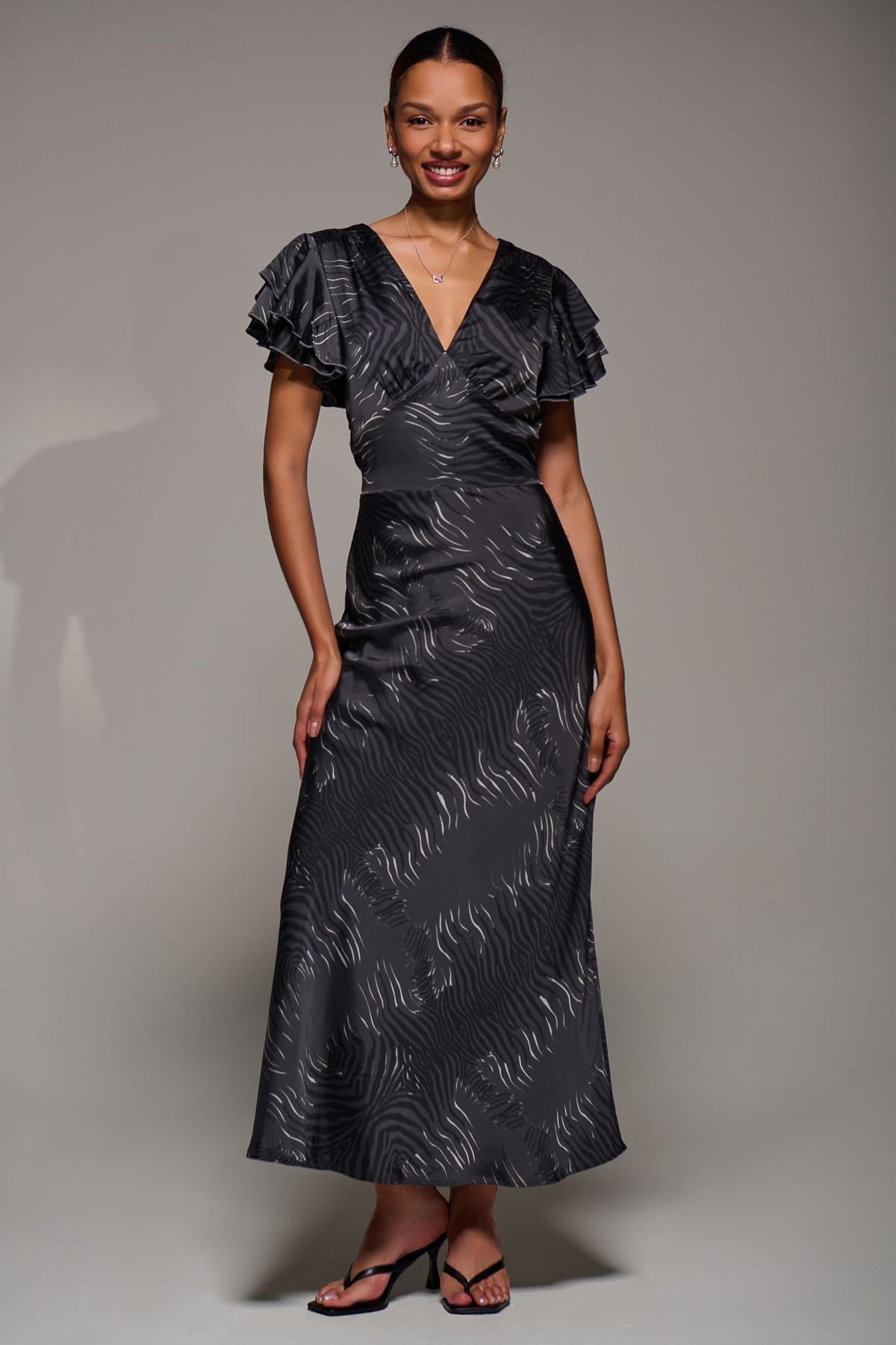 Sophisticated maxi dress in grey satin with a V-neckline and two-tier ruffle short sleeves. The flare skirt and tie-at-waist design offer a flattering fit. Ideal for elegant occasions.
