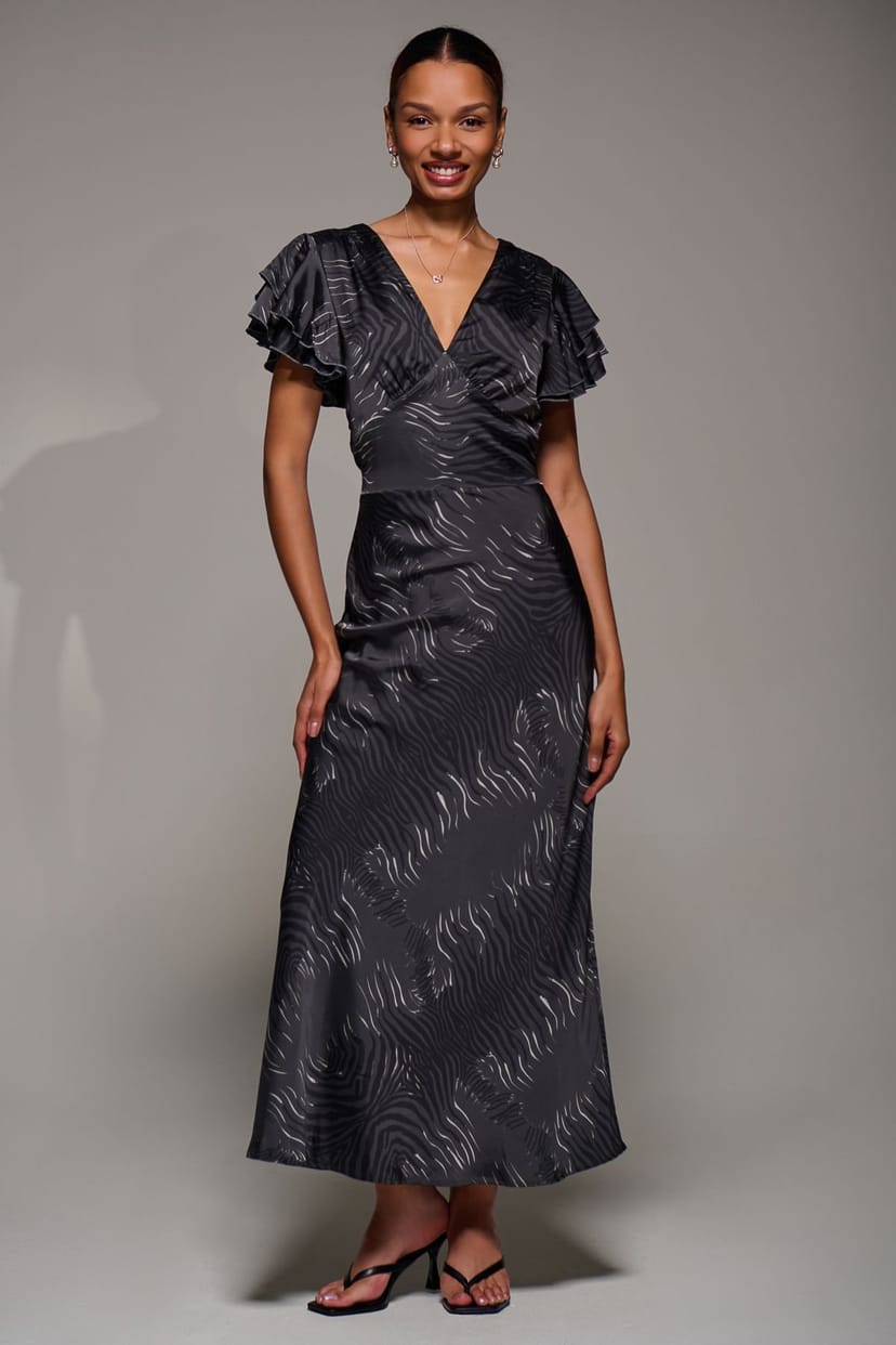 The Jolie Moi Grey Satin Print Maxi Dress is available in sizes 10, 12, 14, 16, 18.
