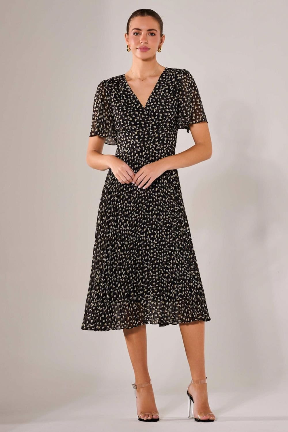 The Jolie Moi Jet Black Chiffon Pleated Midi Dress is available in sizes 12, 14, 16, 18.