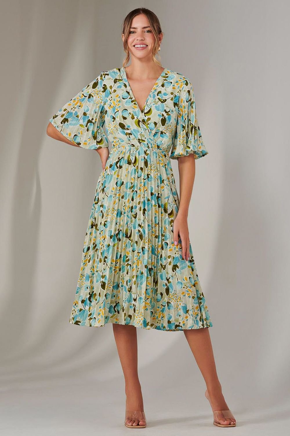 Charming light beige floral midi dress with a flattering wrap V-neckline and flowing pleated half sleeves. The elasticated waistband ensures a perfect fit, while the lightweight fabric offers comfort and ease of movement.