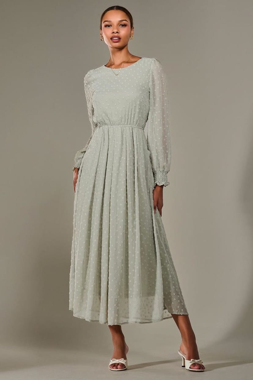 This light green chiffon midaxi dress features a polka dot pattern and long sleeves. The elasticated waist with a tie belt adds a flattering touch. Ideal for evening events or casual outings.