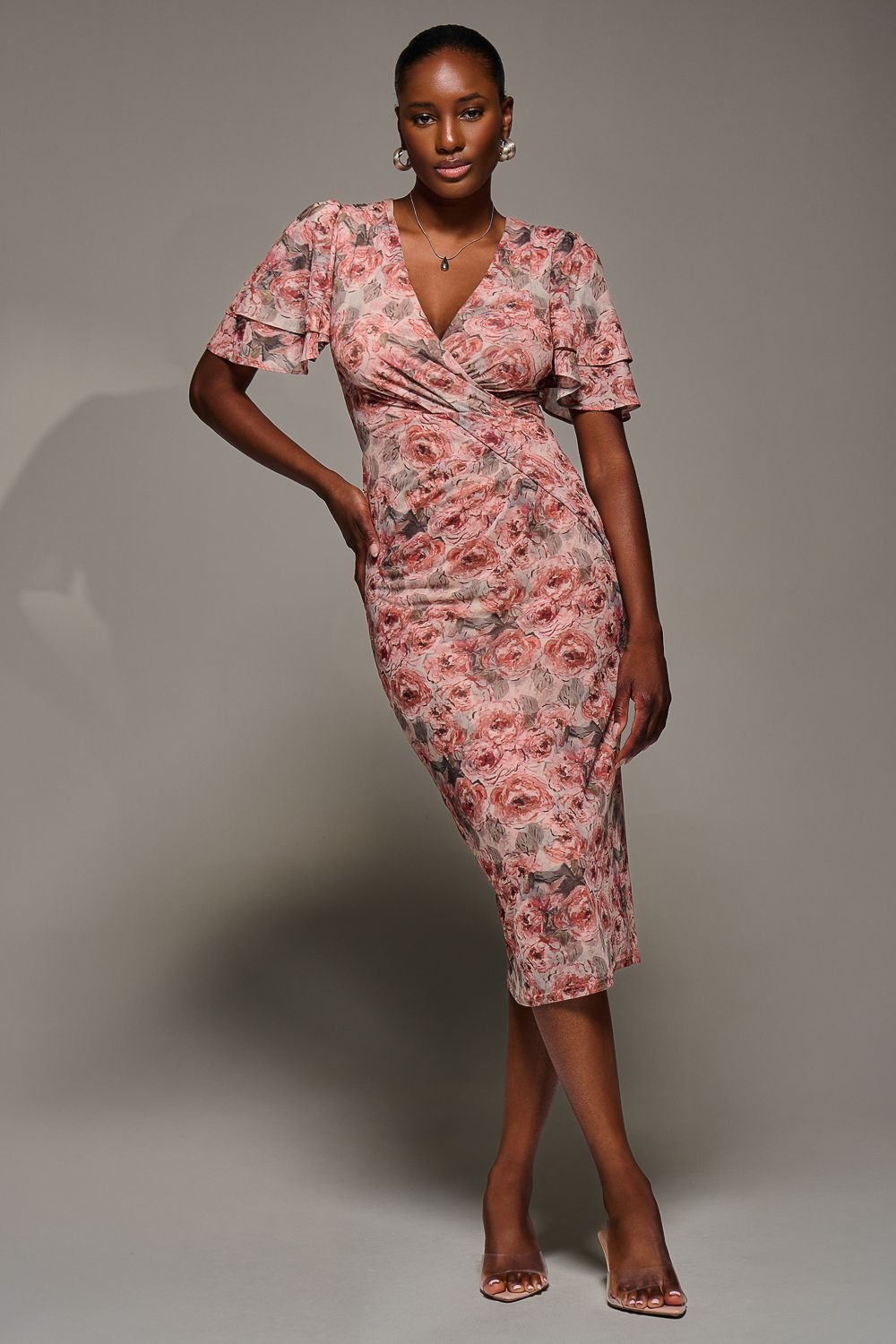 Charming light pink floral bodycon dress with a flattering silhouette. Features a V-neckline, double-layered ruffle sleeves, and pleated waist detailing. Ideal for evening events or special occasions.