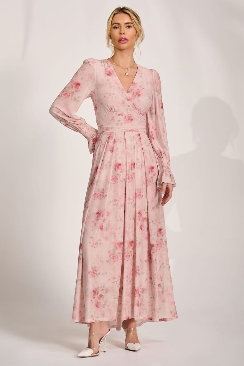 Charming maxi dress by Jolie Moi in light pink floral print. Features a wrap front with a V neckline and a waistband with slight gathers for a soft drape. The dress has long sheer sleeves with shirred, flared cuffs and a high-low hem.
