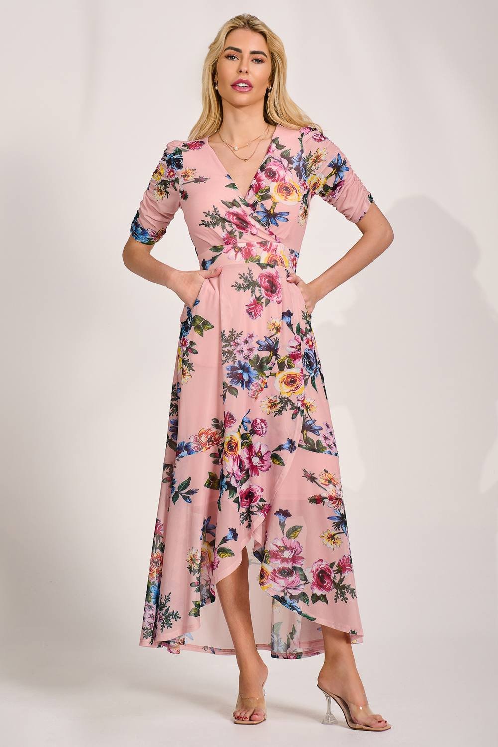 This light pink floral maxi dress by Jolie Moi features a wrap front with V-neckline and a fitted waistband. The wrap skirt has a high-low hem with frill detailing and two pockets. It has elastic ruched short sleeves, a tie at the waist, and is fully lined for comfort.