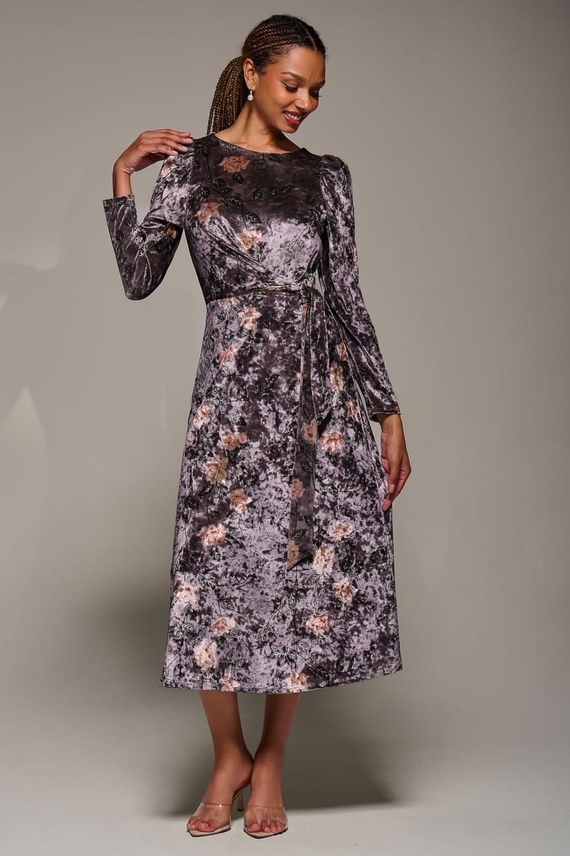 The Jolie Moi Mauve Velvet Floral Midi Dress is available in sizes 10, 12, 14, 16, 18, 8.