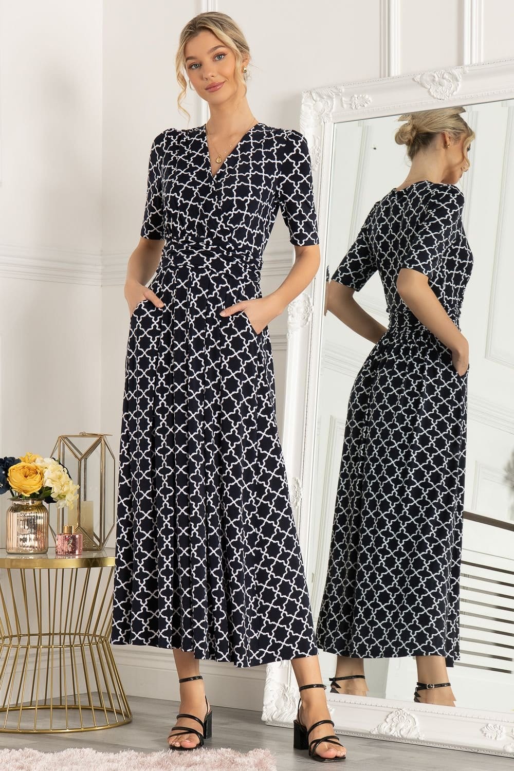 This Mid Navy maxi dress by Jolie Moi features a wrap front design with an abstract print. The elasticated waist ensures a form-flattering silhouette, while the V-neckline and short sleeves add to its elegant appeal.