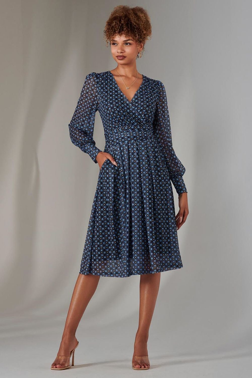 Feel elegant in the Mid Navy Lace Print Midi Dress by Jolie Moi. This style provides an element of fun but also elegance through the use of bold print and colour, as well as being extremely flattering, due to its ruched waistband which creates the illusion of a sinched figure. The mesh long sleeves add a touch of sophistication.