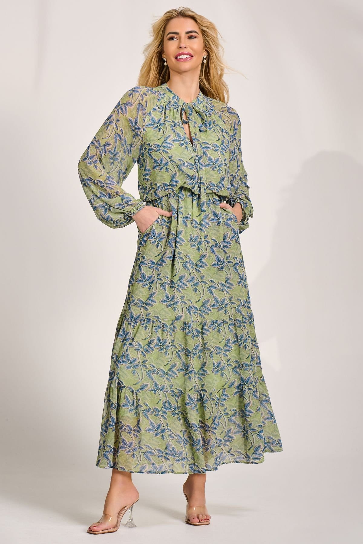 Stylish multicolor chiffon maxi dress by Jolie Moi featuring a shirred tie-front collar and faux buttons down the front. The tiered skirt has an elasticated waistband with slight gathers for a soft drape, and the long sheer sleeves are finished with elastic cuffs.