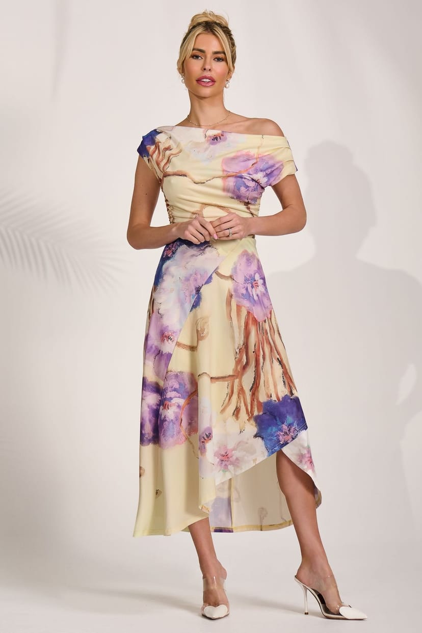 Stylish midi dress in multicolor floral print featuring a cowl neckline and cap sleeves. The dress has a soft drape with pleating at the shoulders and gathers at the sides, finished with a tie at the back. Fully lined for comfort.