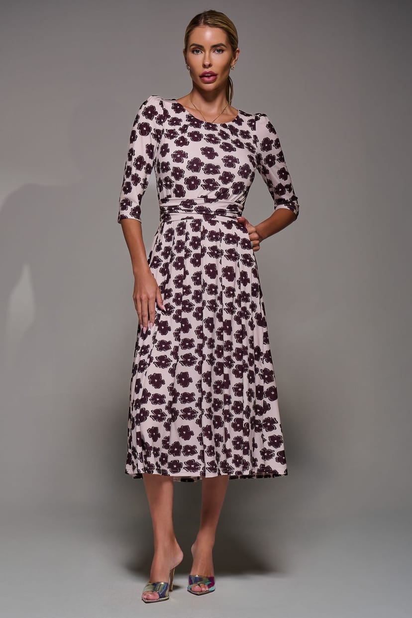Charming midi dress in multicolor floral print featuring a classic round neckline and three-quarter length sleeves. The dress boasts a thick waistband and a tie detail at the back for a flattering fit. Fully lined for comfort, this piece is perfect for casual outings.