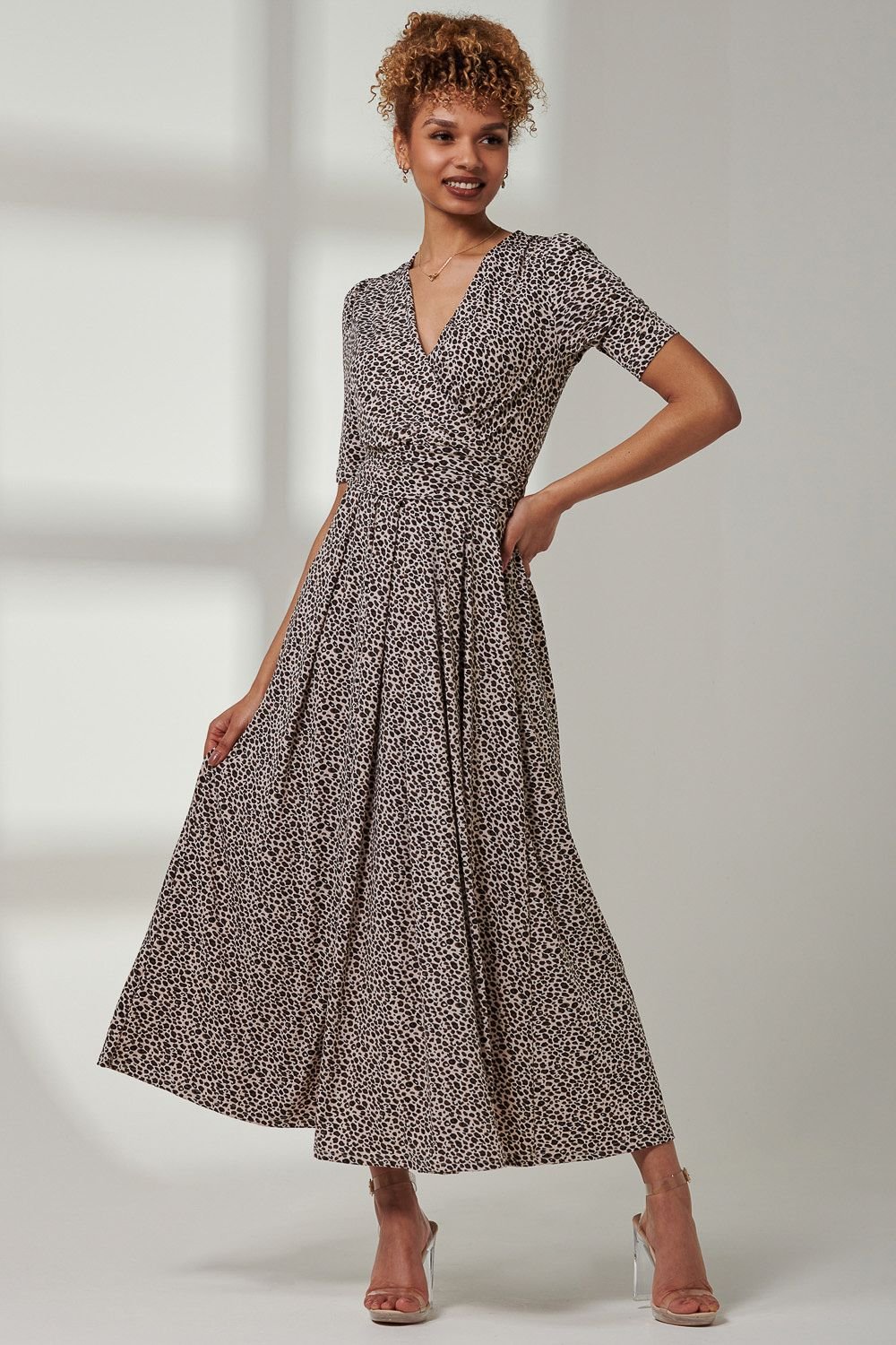 Stylish maxi dress in natural floral print from Jolie Moi. Features a framing v-neckline, short sleeves, and an elasticated waistband with subtle pleats for added movement.