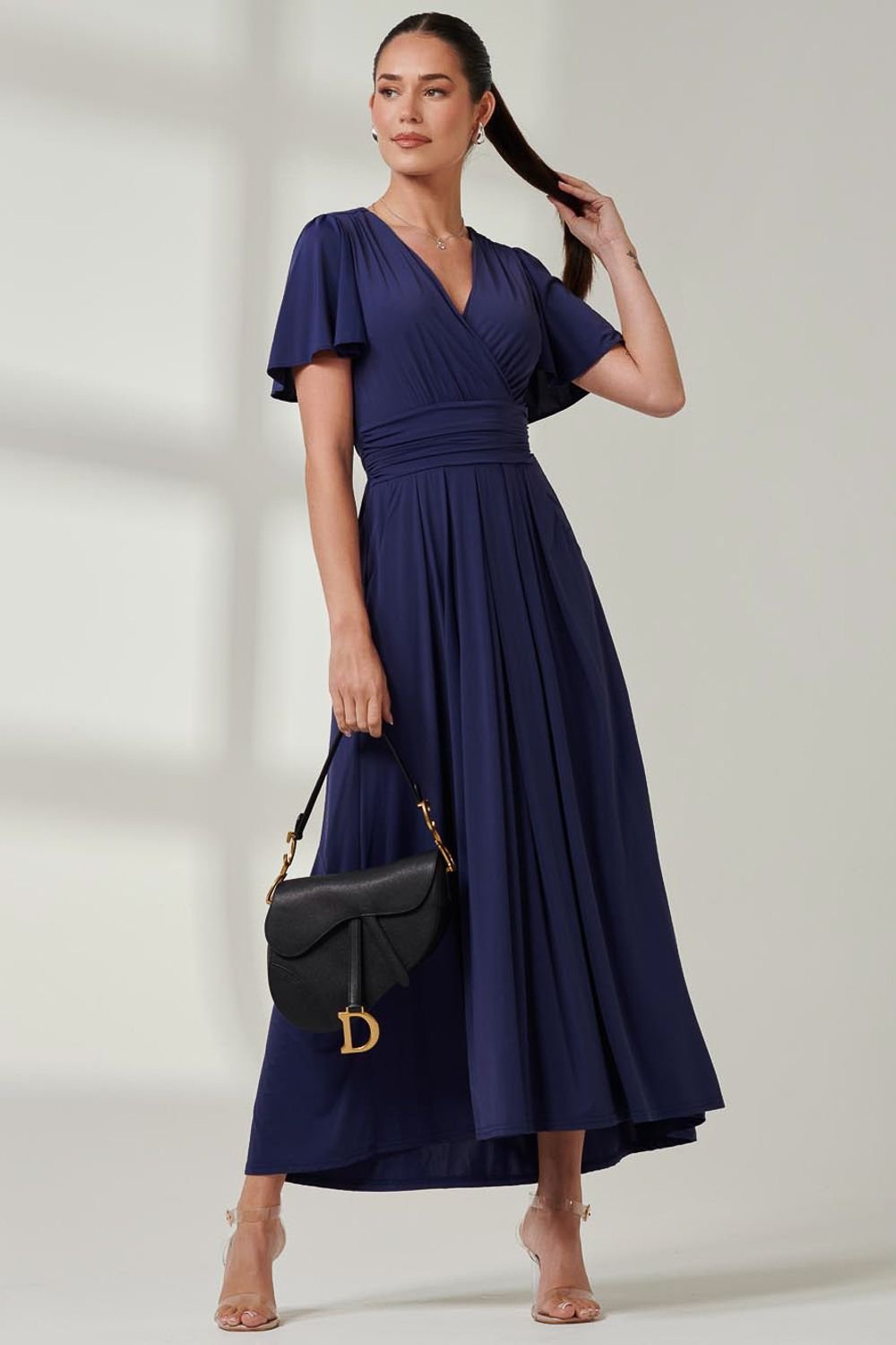 The Jolie Moi Navy Jersey Maxi Dress with Angel Sleeves is ideal for evening, date-night, party.