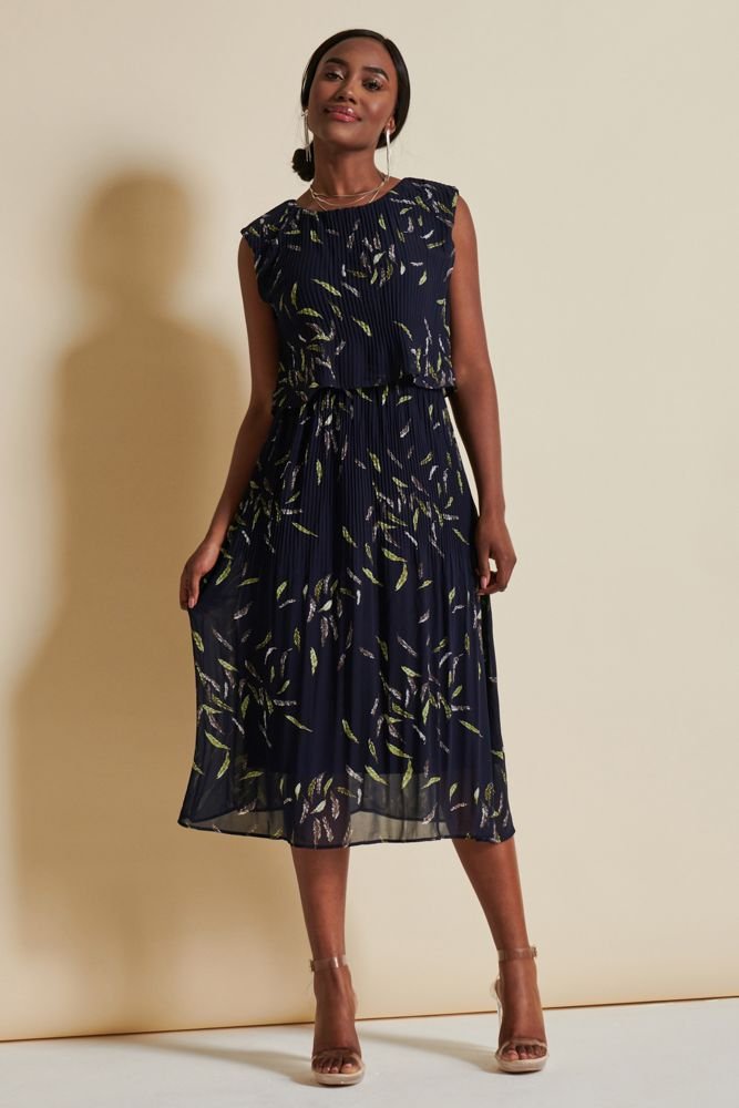 This Jolie Moi midi dress features a floral print on a navy background. Made from chiffon, it has a round neckline and sleeveless design. The pleated overlay adds a stylish touch, perfect for any occasion.