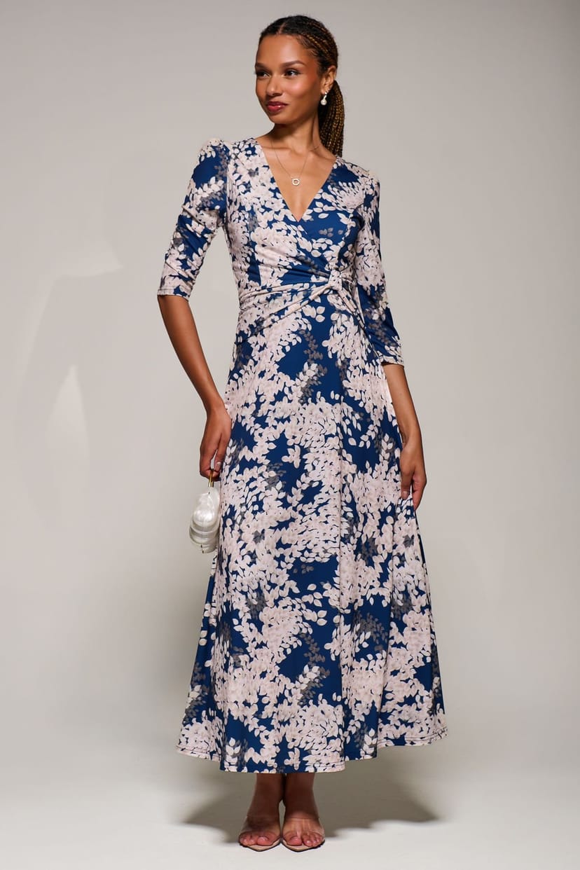 This Navy Floral Jersey Maxi Dress by Jolie Moi features a flattering V-neckline and elegant three-quarter sleeves. A tie at the back cinches the waist, creating a beautiful fit-and-flare silhouette. The front is adorned with a delicate bow detail, adding a unique and feminine touch to this versatile dress.