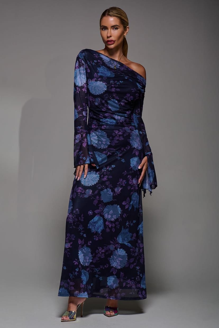 Exude effortless chic in the Navy Floral Print Maxi Dress from Jolie Moi. Featuring a flattering slash neckline and long sleeves, this dress is perfect for your next autumn winter wedding. Adorned in a gorgeous abstract floral print that cascades over soft airy mesh fabric, this is the dress of the season.