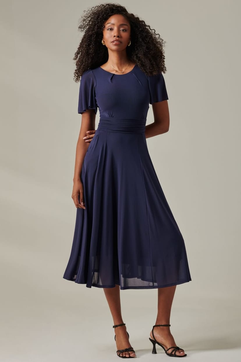Chic midi dress in navy mesh featuring floaty sleeves and a rounded neckline. The fit and flare silhouette adds a touch of elegance, perfect for any special occasion.