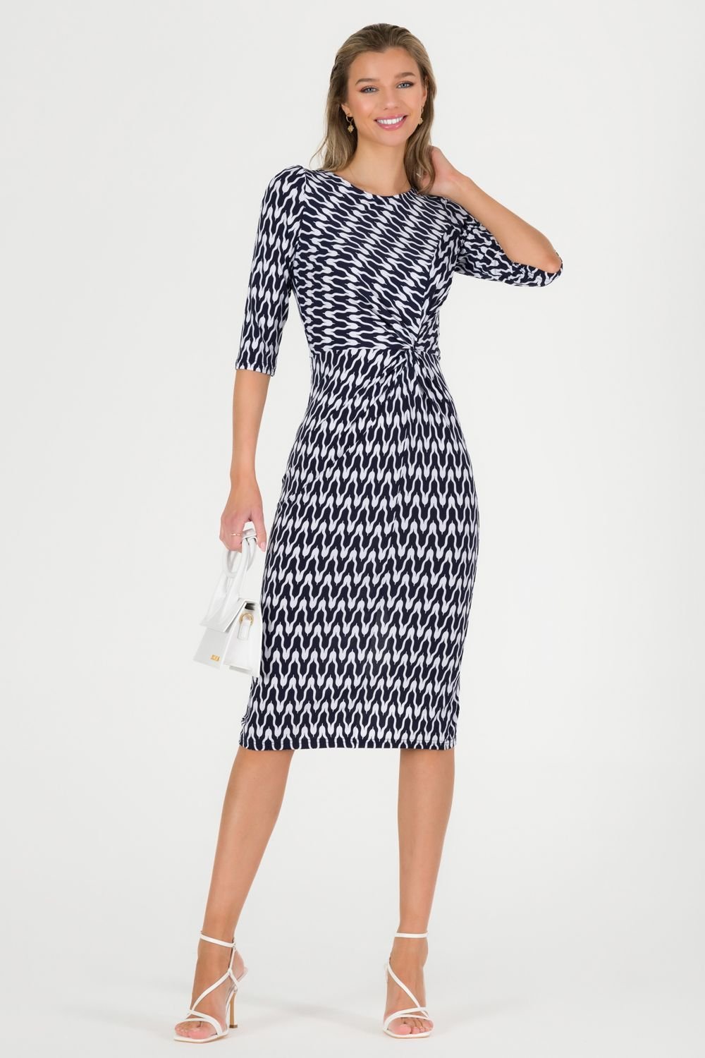 Stylish midi dress in navy with a geometric print and bodycon silhouette. Features short puff sleeves and a below-the-knee hem. Made from premium non-static and crease-proof jersey.