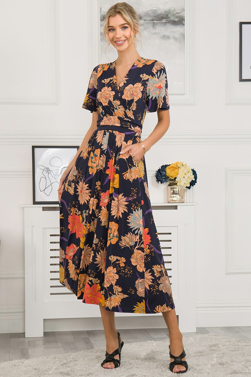 This Navy floral jersey maxi dress from Jolie Moi features a stunning floral print and a soft drape. Made from non-static and crease-proof jersey fabric, it offers all-day comfort. Ideal for any occasion.