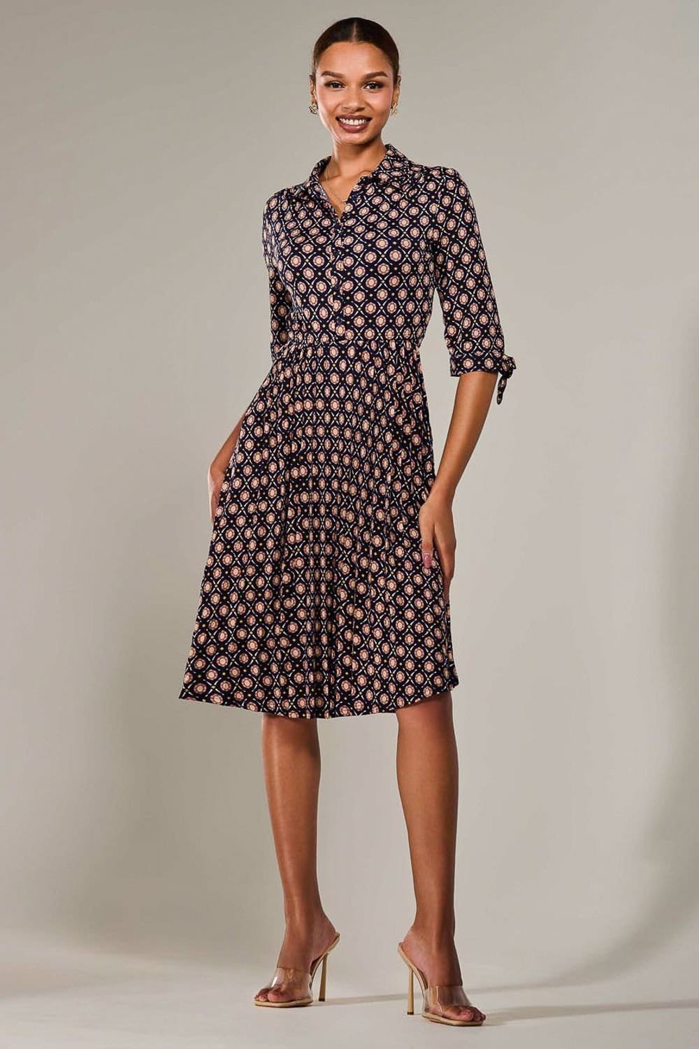 Stylish midi dress in navy with an abstract floral print. Features ¾ sleeves with tie sides and a pleated skirt for a feminine touch. Ideal for everyday wear.