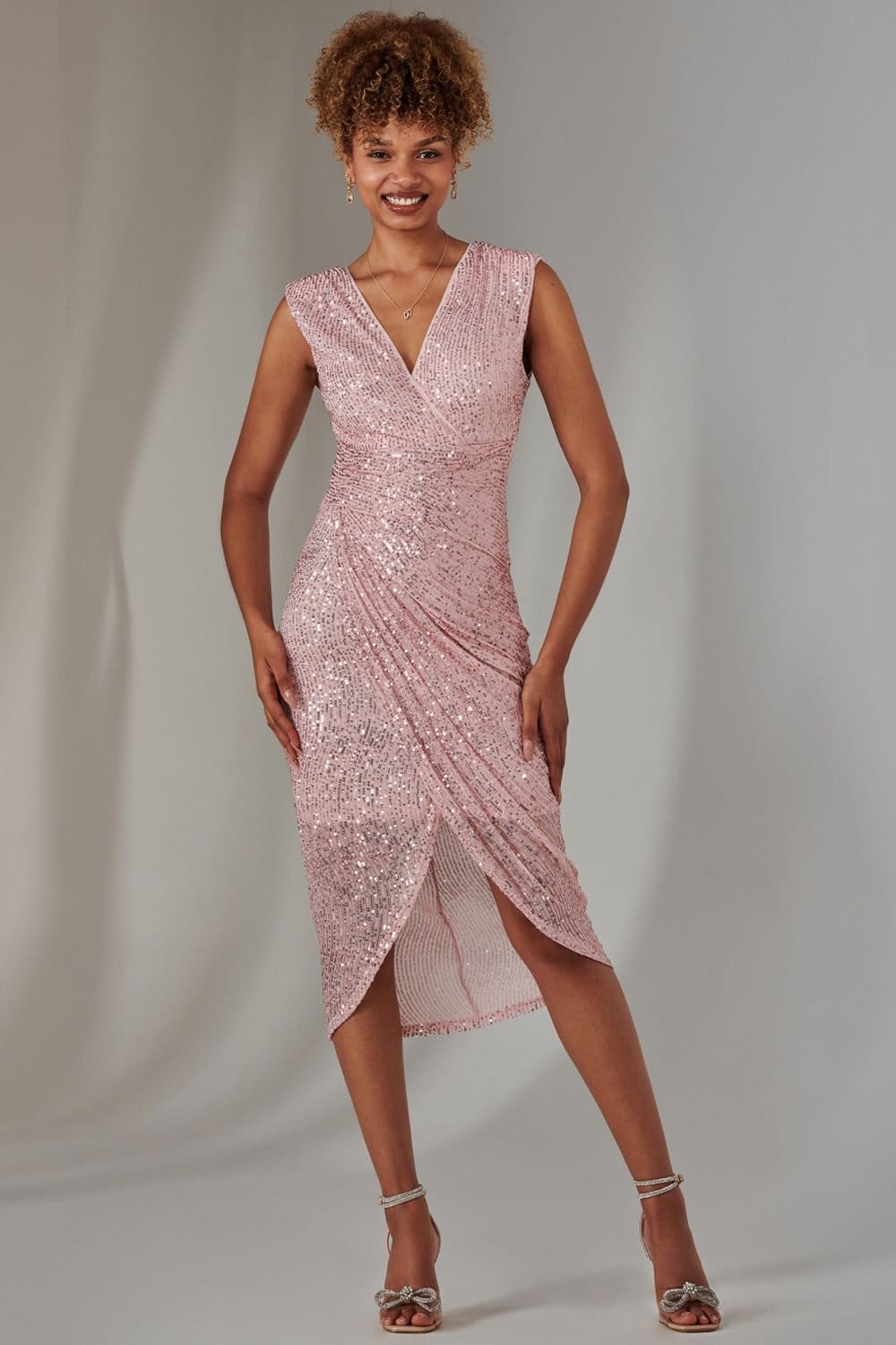 Dazzling pink sequin bodycon dress with a flattering V-neckline and elegant ruched detailing. The stylish front slit adds allure. Perfect for evening events.