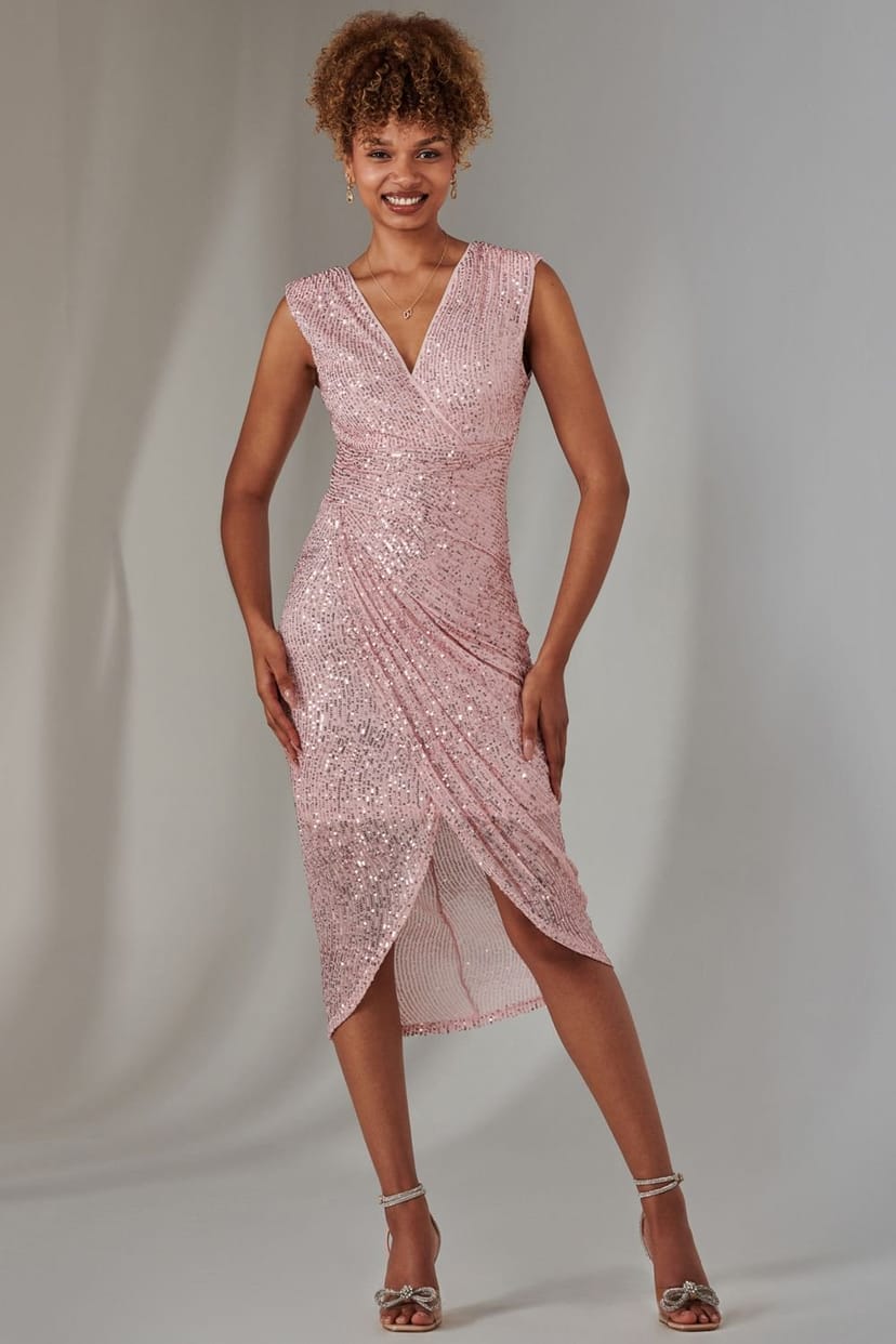 The Jolie Moi Pink Sequin Bodycon Dress is available in sizes 12, 14.
