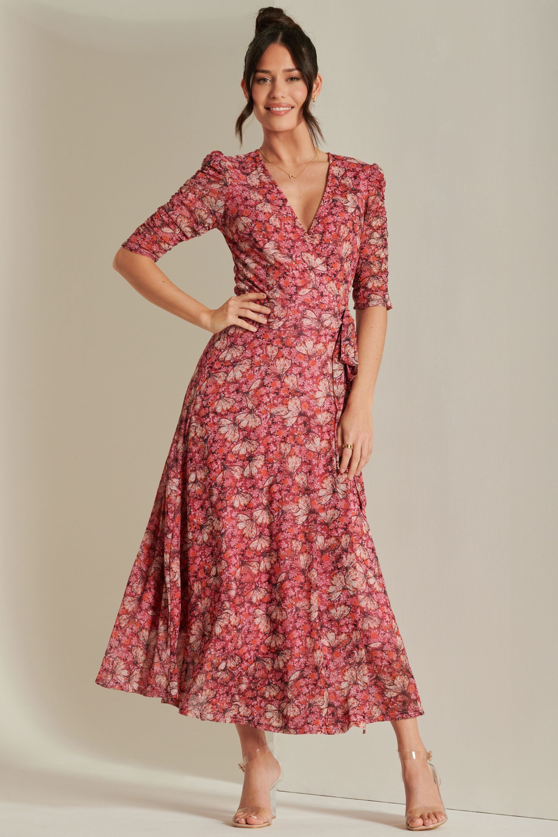 Charming pink floral print maxi dress from Jolie Moi. Features a wrap front design and elbow-length cropped sleeves. The airy mesh fabric ensures breathability and comfort.
