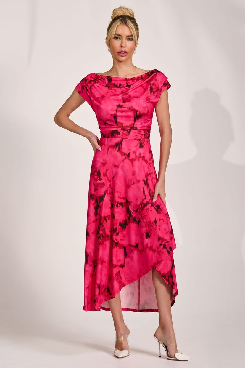 This pink jersey midi dress by Jolie Moi features a versatile cowl neckline, subtle pleating at the shoulders, and gentle gathers at the sides for a soft drape. It has cap sleeves and a tie at the back, with an asymmetric wrap front skirt. Fully lined for comfort.