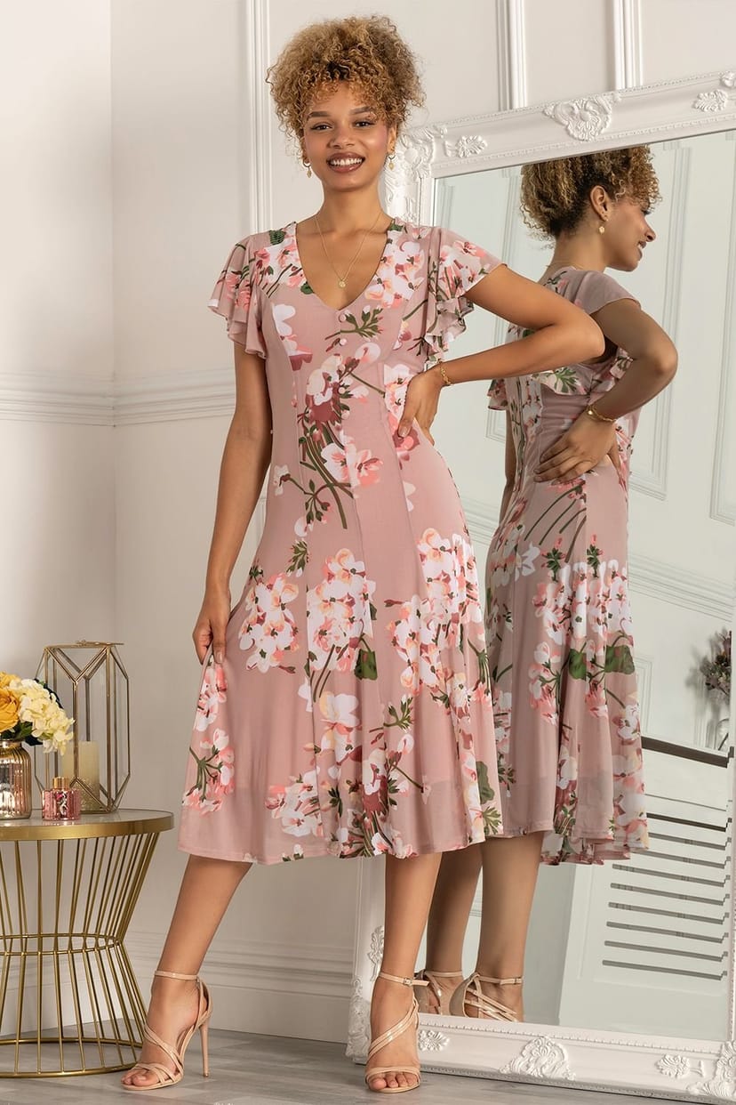 Charming pink floral mesh dress by Jolie Moi featuring a flattering wrap-over V-neckline and shot angel sleeves. The dress is fully lined and has an invisible back zip fastening with decorative front buttons. Ideal for a feminine and elegant look.