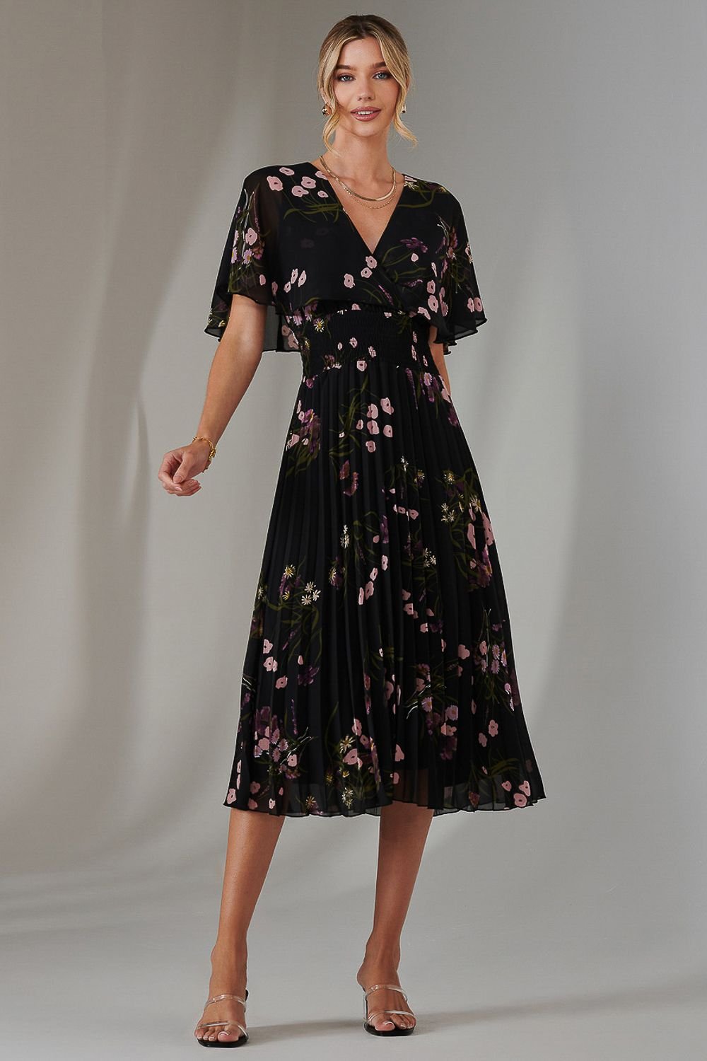 Step into effortless elegance with the floral print chiffon pleated dress from Jolie Moi. This enchanting dress features delicate butterfly sleeves and a flattering v-neckline, offering a stylish yet comfortable fit. The stretchy shirred waistband cinches the waist beautifully, while the flowing pleats add a touch of movement.