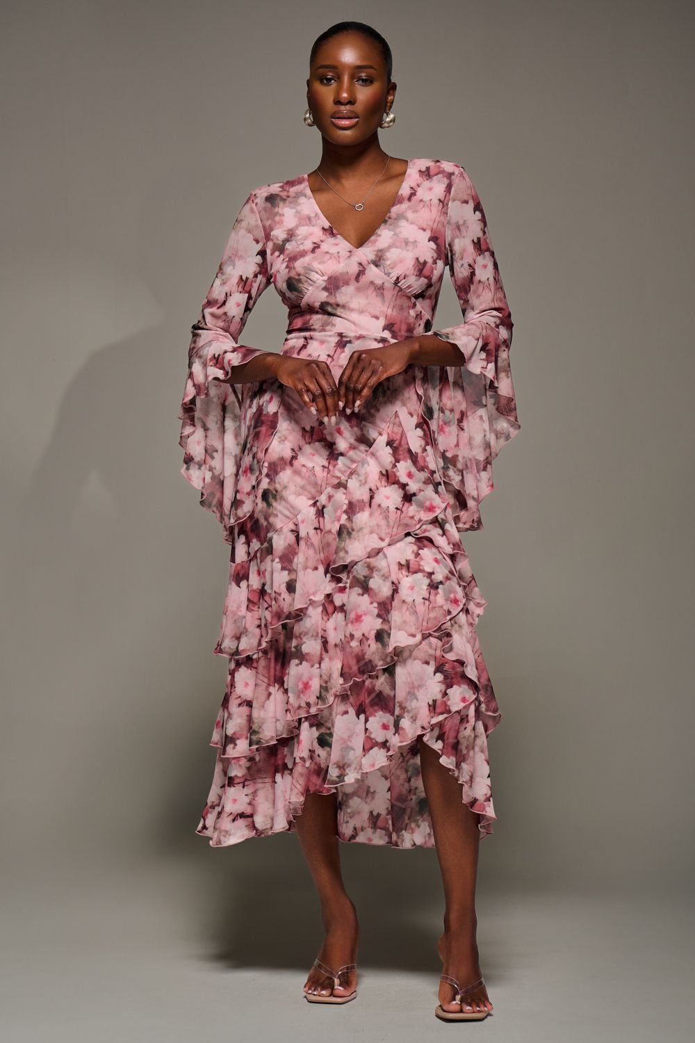 Charming midi dress in pink floral mesh with a V-neckline and ruffled sleeves. The tiered hem adds a playful touch, perfect for evening events or date nights.