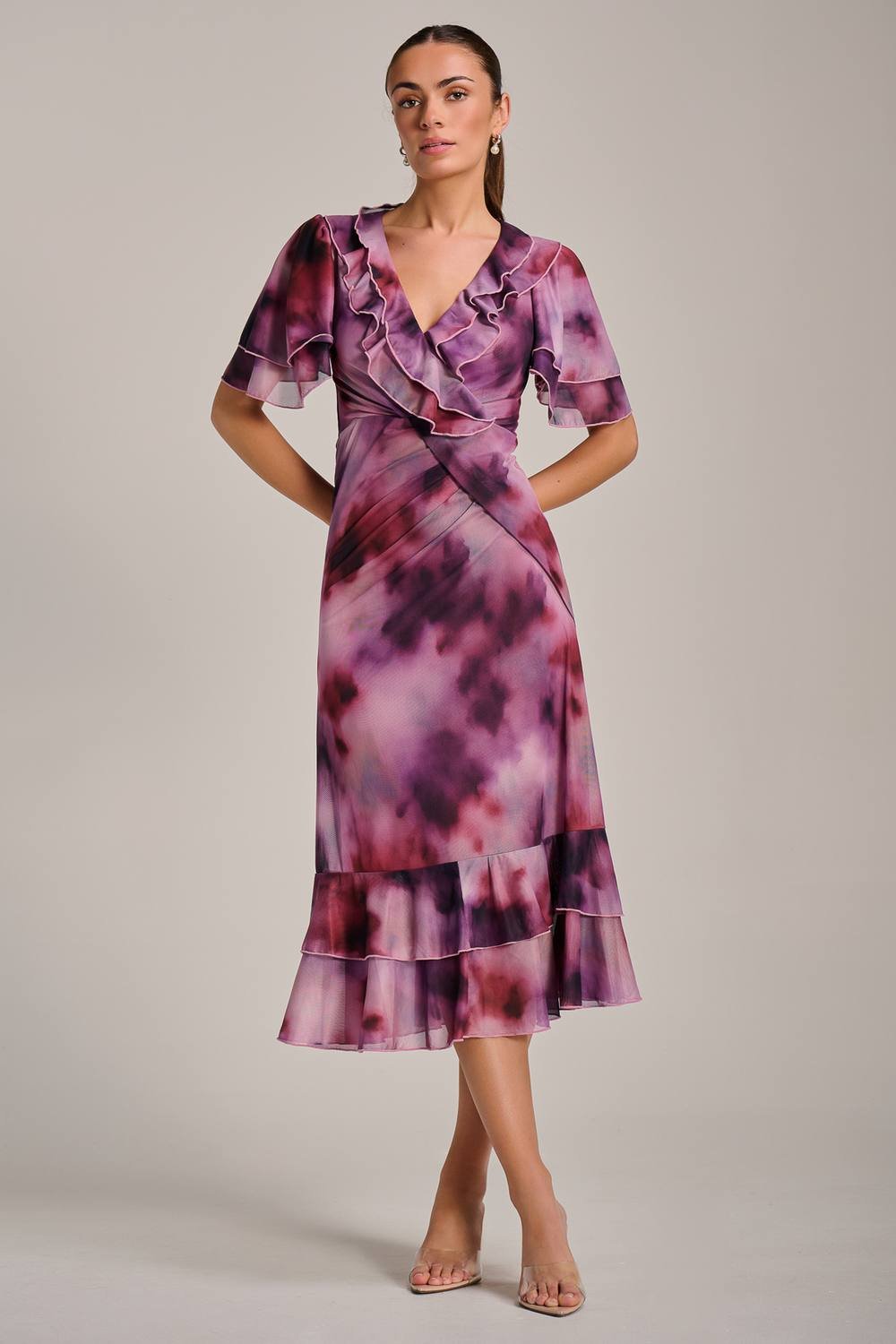 This pink ruffle mesh midi dress from Jolie Moi features a ruffle V neckline, two-tier ruffle short sleeves, and a draping detail at the front. The ruched waist and flared skirt with a two-tier ruffle hem create a soft, flattering silhouette, adding gentle movement and a feminine touch.